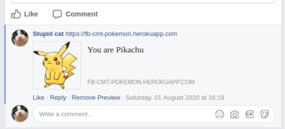 Chúng ta sẽ không làm lại theo ý tưởng mà tôi đã thấy, chúng ta sẽ làm cái gì đó vui nhộn một chút. “Bạn là Pokémon nào?” đúng rồi tôi thích Pokémon ? Khi có một người comment url app của chúng ta Fb sẽ hiển thị phẩn preview là ảnh một chú Pokémon và tên của nó. Giống như thế này: